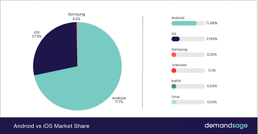Here is the recent survey by Demandsage in January 2026, in which Android holds a global market share of 71.7%, followed by iOS with 27.9%.